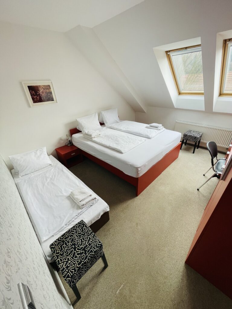 Prostorný podkrovní pokoj se střešními okny, vlastní koupelnou, TV, minibarem, bez balkonu. Postel manželská, nebo všechny 3 postele oddělené. Dostupný po schodech.